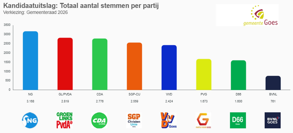 De uitslag van de gemeenteraadsverkiezingen 2026 van de gemeente Goes